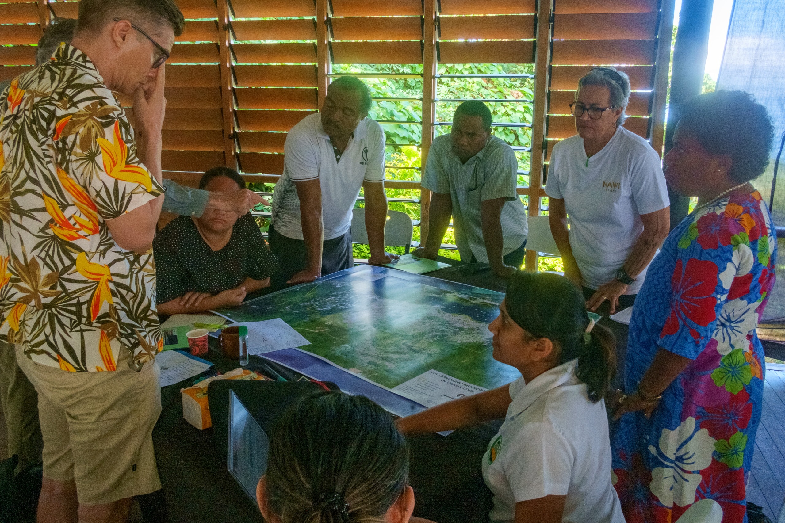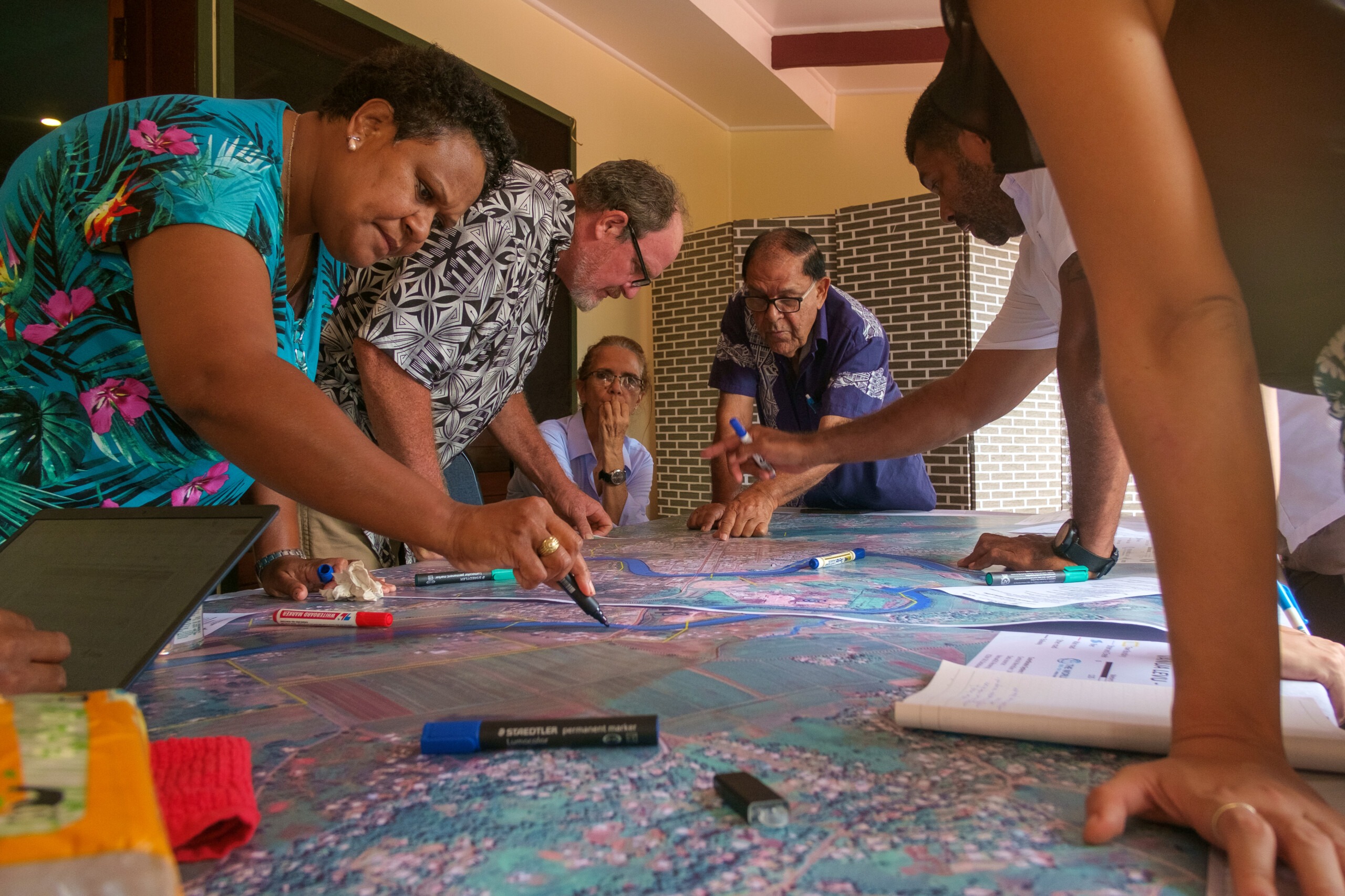 The ICEM team completed five participatory mapping workshops with stakeholders who had in-depth knowledge of local biodiversity hotspots, and sustainable tourism activities and opportunities. Three were held with government representatives, non-government organisations and private sector stakeholders in Suva, Labasa and Savusavu. Stakeholders were asked to draw and annotate areas of tourism, environmental and conservation interest in their relevant municipality, and in the wider Northern Division, on high-resolution A0 satellite images.